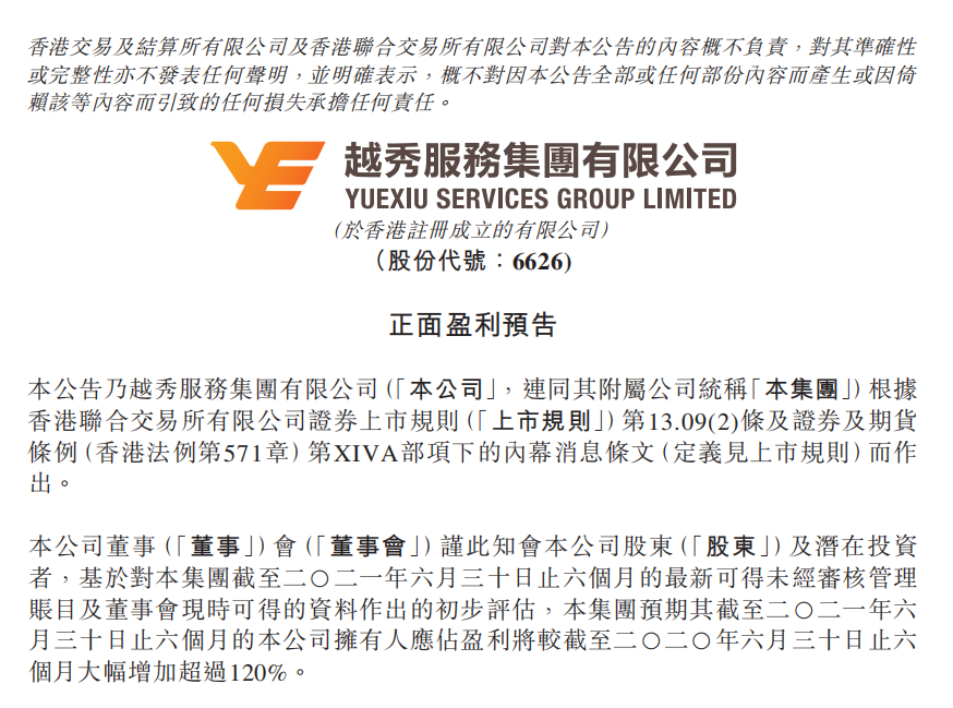 7月15日,九州酷游服务集团有限公司(6626.HK)发布盈利预喜公告。公告称经过初步评估,集团预期截至2021年6月30日为止的六个月,公司拥有人应占盈利将同比大幅增加超过120%。